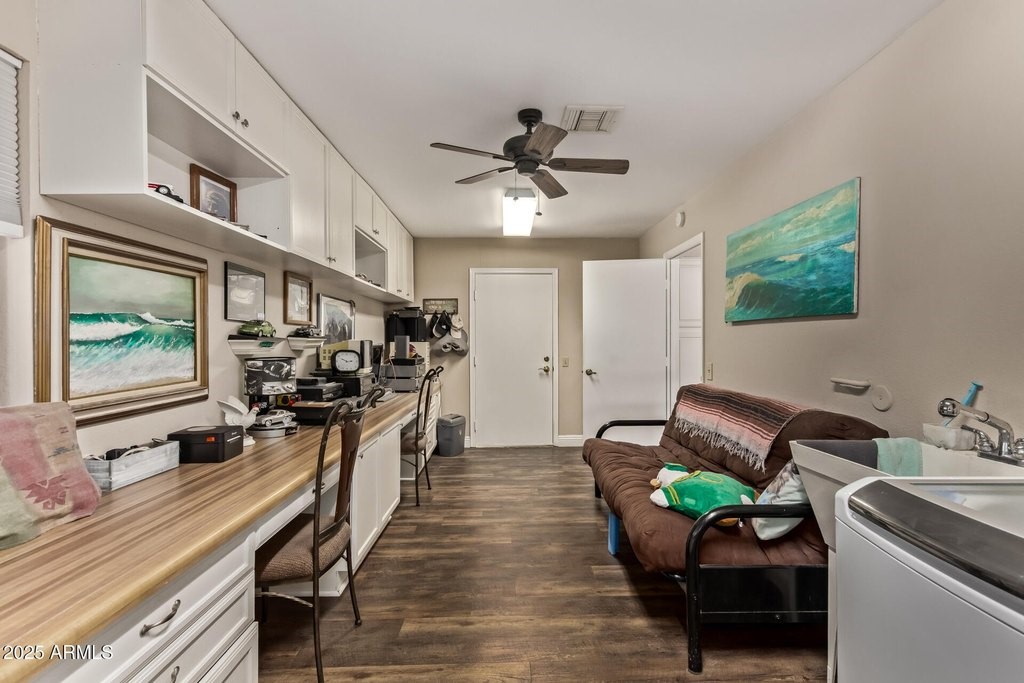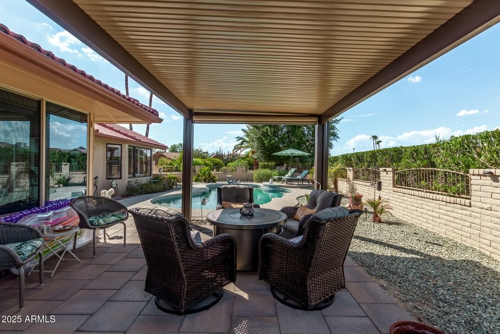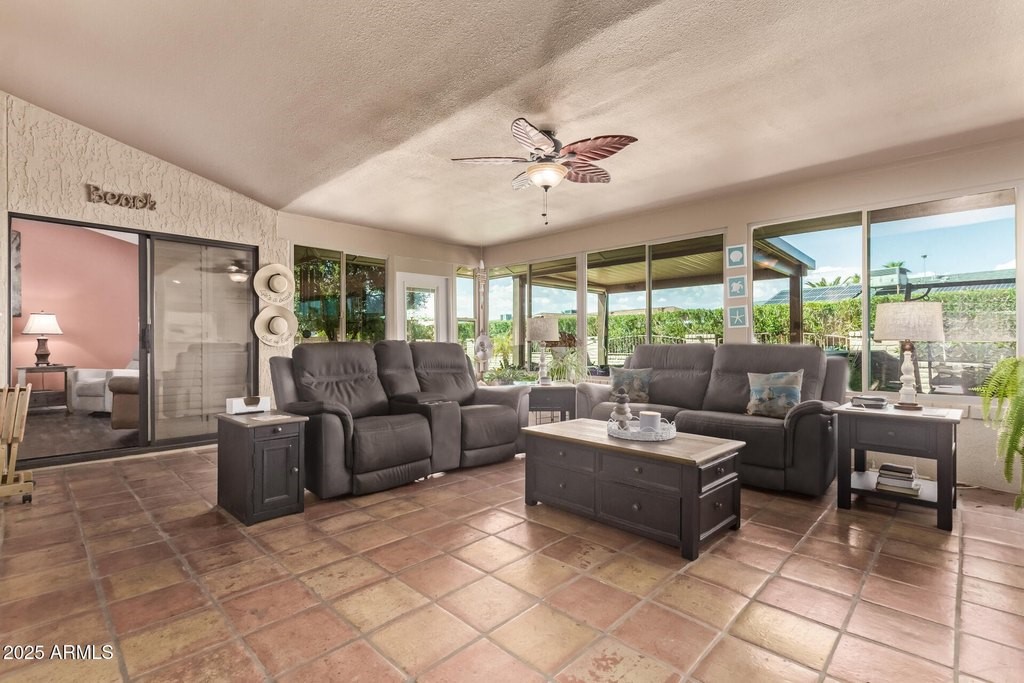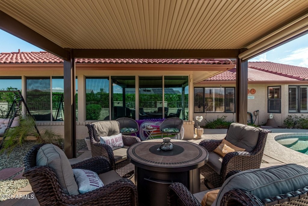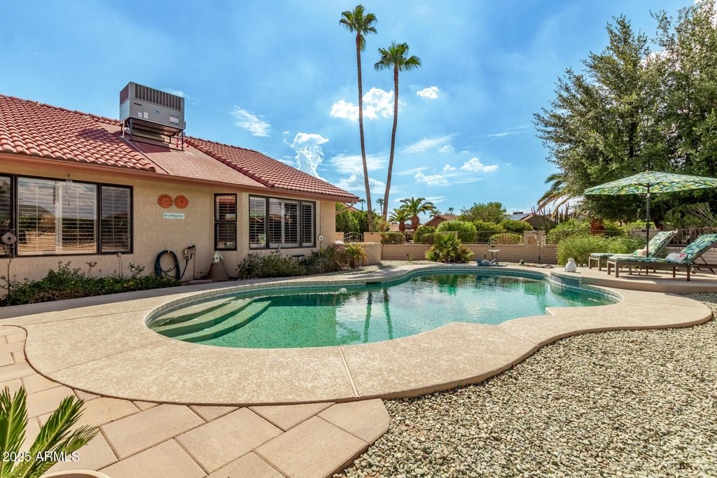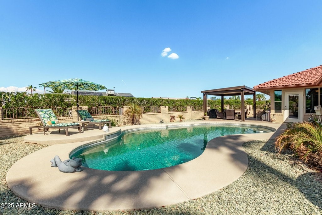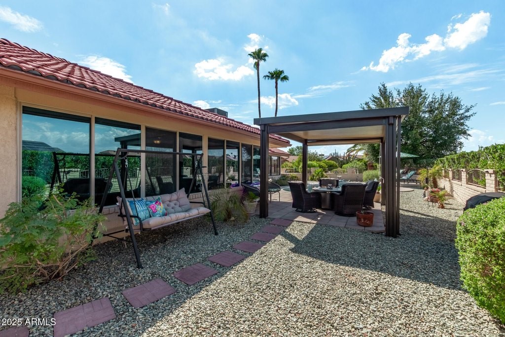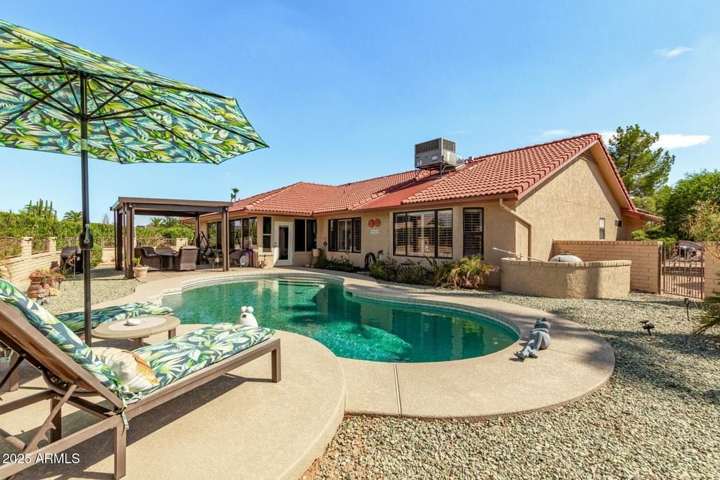 This popular San Carlos model features an enclosed AZ room with heat & cool along with a bathroom for an additional 500 sq ft! Meticulously maintained and tastefully decorated with neutral colors and white shutters. Easy care and beautiful vinyl plank flooring throughout, with Saltillo tile in AZ room. 2 bedrooms, 3 bathrooms, living/dining, family room, spacious kitchen with eat-in room, and utility/flex room includes the laundry room and built in desks and cabinets for work areas. Out back there is a pool and gazebo with a pull down shade. The photos are misleading-this elbow lot is much larger-it extends past the fence around the pool. You'll enjoy your low APS bills with the fixed Tesla Solar Lease at only $149.67/month. The 2 car garage has attached cabinets.