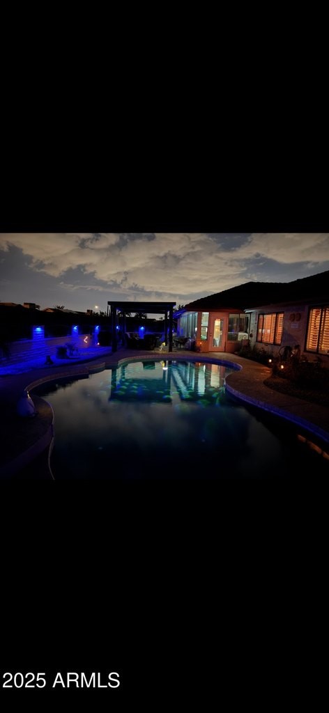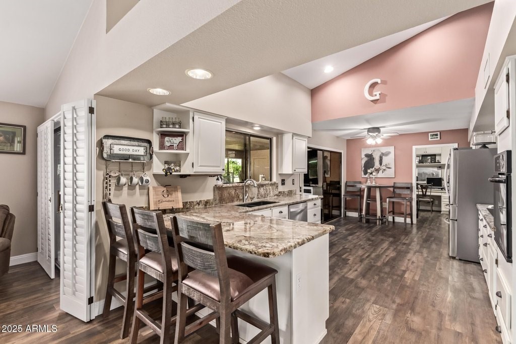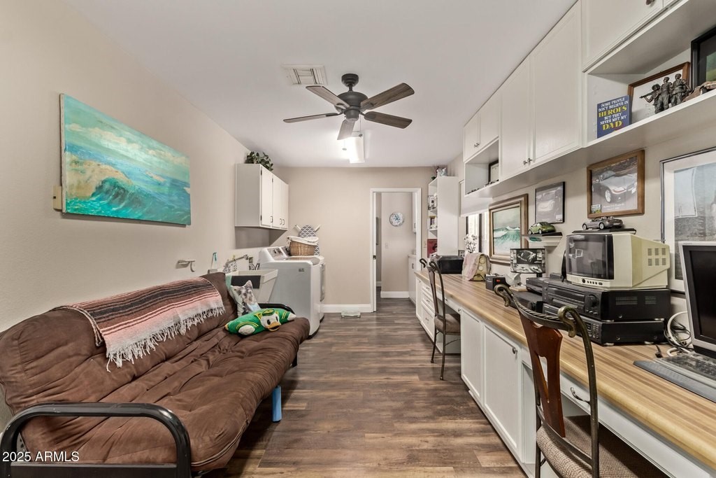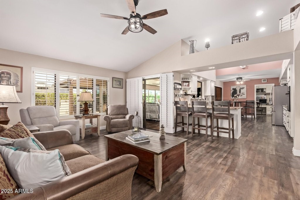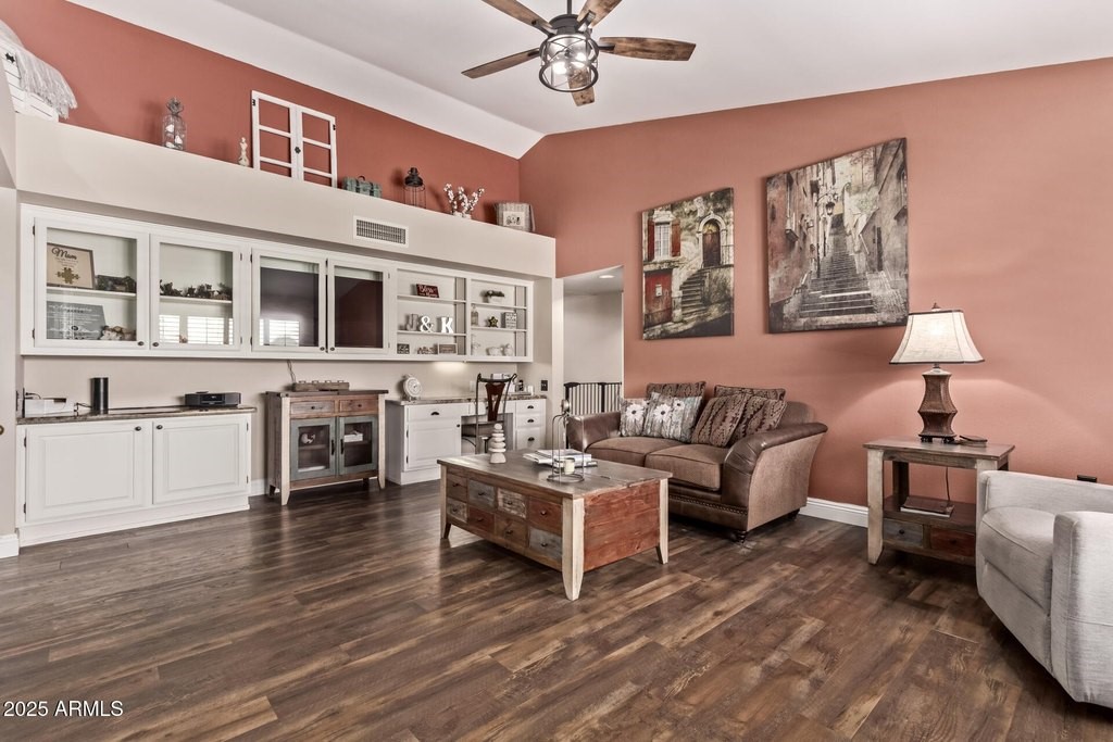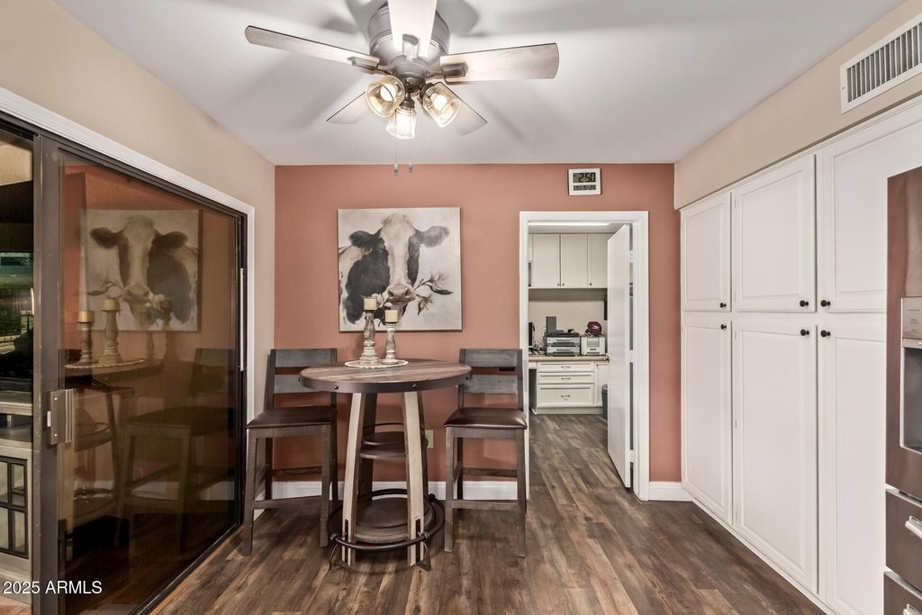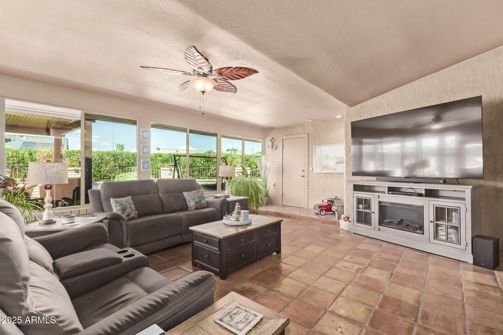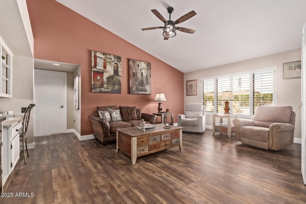 This popular San Carlos model features an enclosed AZ room with heat & cool along with a bathroom for an additional 500 sq ft! Meticulously maintained and tastefully decorated with neutral colors and white shutters. Easy care and beautiful vinyl plank flooring throughout, with Saltillo tile in AZ room. 2 bedrooms, 3 bathrooms, living/dining, family room, spacious kitchen with eat-in room, and utility/flex room includes the laundry room and built in desks and cabinets for work areas. Out back there is a pool and gazebo with a pull down shade. The photos are misleading-this elbow lot is much larger-it extends past the fence around the pool. You'll enjoy your low APS bills with the fixed Tesla Solar Lease at only $149.67/month. The 2 car garage has attached cabinets.